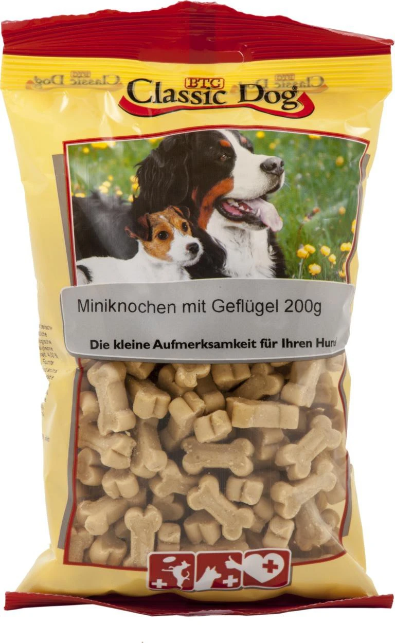 Suchen Sie nach einem gesunden und leckeren Futter für Ihren Hund, sind Sie bei zooheld.de richtig. Kaufen Sie bei uns Classic Dog Miniknochen mit Geflügel im 12x 200 g Pack online. Bei uns bekommen Sie alles, was Sie für die Haltung und Pflege Ihres Haustieres benötigen. Ob Hund, Katze, Fische, Nager, Vögel oder Pferde, bei uns können Sie Ihren kompletten Tierbedarf kaufen. Wir führen neben Nass- und Trockenfutter auch Spezialfutter für Problemfälle. Sie werden bei uns auch immer günstige Angebote finden und praktische Vorratspackungen. Ab einem Bestellwert von 29 Euro liefern wir Ihnen die Ware versandkostenfrei an Ihre Wunschadresse. Natürlich können Sie die Artikel innerhalb von 30 Tagen zurückgeben, falls Sie Ihnen nicht gefallen. Sehen Sie sich einfach in unserem großen Sortiment um und finden Sie alles was Sie benötigen. Bei Fragen und Anregungen steht Ihnen unser Support zur Verfügung, der Ihnen gerne weiterhilft.