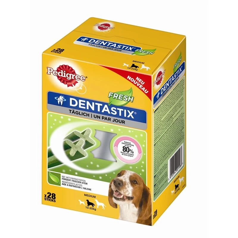 Suchen Sie nach einem gesunden und leckeren Futter für Ihren Hund, sind Sie bei zooheld.de richtig. Kaufen Sie bei uns Pedigree Denta Stix Fresh Multipack im 4x 28 Stück Pack online. Bei uns bekommen Sie alles, was Sie für die Haltung und Pflege Ihres Haustieres benötigen. Ob Hund, Katze, Fische, Nager, Vögel oder Pferde, bei uns können Sie Ihren kompletten Tierbedarf kaufen. Wir führen neben Nass- und Trockenfutter auch Spezialfutter für Problemfälle. Sie werden bei uns auch immer günstige Angebote finden und praktische Vorratspackungen. Ab einem Bestellwert von 29 Euro liefern wir Ihnen die Ware versandkostenfrei an Ihre Wunschadresse. Natürlich können Sie die Artikel innerhalb von 30 Tagen zurückgeben, falls Sie Ihnen nicht gefallen. Sehen Sie sich einfach in unserem großen Sortiment um und finden Sie alles was Sie benötigen. Bei Fragen und Anregungen steht Ihnen unser Support zur Verfügung, der Ihnen gerne weiterhilft.